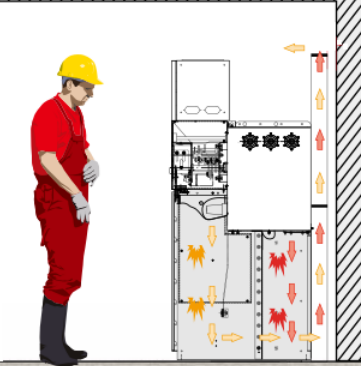 壓力通過后部通道上部釋放出來,氣流出來后沿著箱頂部走,氣流已經過長距離的流動,燃燒火焰及沖擊力已明顯減小,對設備和人員的傷害較小,避免釋放到電纜溝對電纜的破壞,或氣箱電弧壓力直接從頂部釋放到開關室頂部反彈,直接損傷柜前人員,或反彈進一步燒損其它設備。