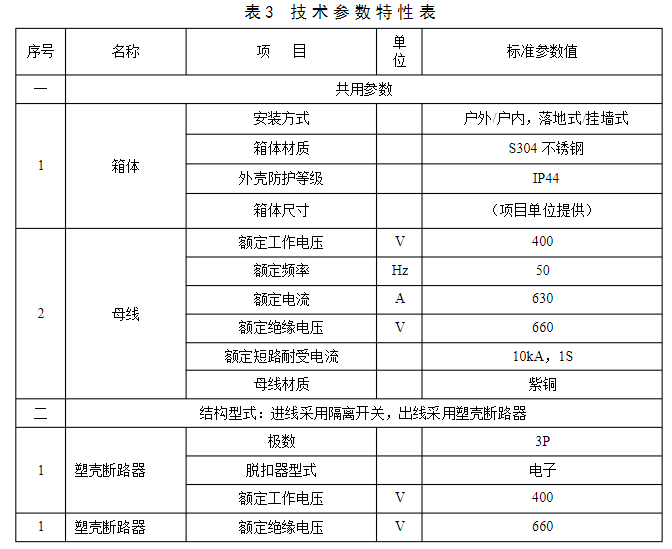 2.3.11在運用中能夠交換的具有同樣額定值和結構的組件,應具有交換性。3標準技術參數技術參數特性表是對收買設備的基礎技術參數要求,供貨方應對技術參數特性表中標準參數值進行呼應。低壓電纜分支箱技術參數特性見表3