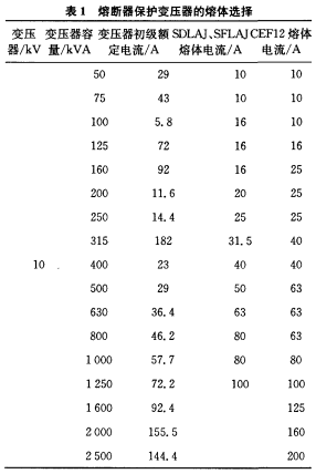 根據1989年世界配電網會議提供的材料,當油浸變壓器內產生短路毛病時,短路電弧會使油氣形成氣泡而占據原先歸于油的空間,油將壓力傳給變壓器外璧,跟著短路的繼續而壓力愈來愈大,直到油箱迸裂。要使油箱不被迸裂,必須在20ms內切除毛病。斷路器的動作時刻是維護動作時刻和斷路器固有動作時刻兩部分之和,其值不小于60ms,可見斷路器不能達到維護油浸變壓器的意圖。負荷開關+熔斷器環網柜則能夠有效地維護變壓器,熔斷器維護變壓器的熔體挑選表1。