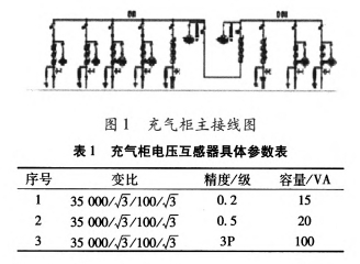 變電站位于高原地區,海拔2100m。變電站選用某公司出產的35kV中壓充氣柜。主接線如圖1所示,其間電壓互感器型號為JDZx-35(ABC),具體參數如表1