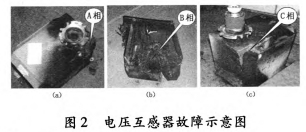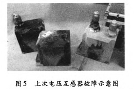 20113300:38,35kV垣潔線、35kV垣宏回AB相電壓互感器擊穿,如圖5所示;201232619:7:58,35kV垣潔線56號線路電壓互感器ABC相損壞,AB相有迸裂現象。