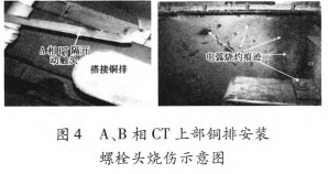 斷路器氣室內部PT阻隔開關A相動觸頭變形,未搭在接觸銅排上,端頭有顯著炙烤痕跡;B相動觸頭端頭有燒傷痕跡;ACT旁氣室壁有顯著燒傷痕跡;A相和BCT上部銅排設備螺栓頭燒傷,斷路器室頂部方位有電弧燒傷痕跡,如圖4所示。