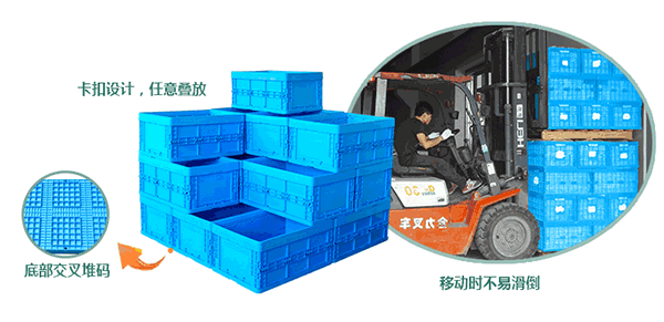 5、防滑防倒: 箱子底部交叉堆碼,卡扣設計,任意疊放,防止箱子在移動時因堆高而易滑倒
