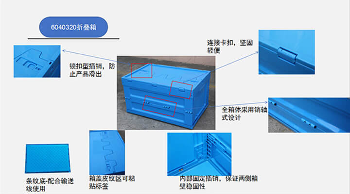 折疊箱采用國際流行款式,根據折疊方式的不同,有對折式和內倒式兩種折疊方法,折疊后的體積只有組立時體積的1/4-1/3,具有重量輕、占地少、組合方便等優點。已在各大連鎖超市、24小時便利店、大型配送中心、百貨商場、輕工、服裝、家電、食品加工等閉環回路配送系統中廣泛使用。對折式折疊周轉箱有400×300mm、600×400mm、650×440mm、530×365mm四個系列10多種規格。和1210型國際標準、1208型歐洲標準或1111型日本標準托盤配合,可實現機械化搬運,提高了流通合理化、效率化,使用戶儲運成本大大降低。是一種符合現代企業推行環保要求及零庫存計劃的新型產品